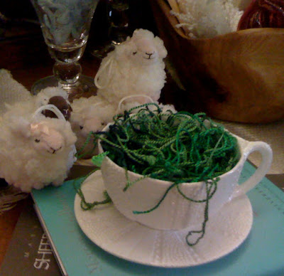 The adornment is my own design. OK - I have a confession to make. I am obsessed with those little green tags that come attached to the Vera Bradley handbags. (I mean totally obsessed!) I save every single tag from every piece of Vera Bradley that I own. My family and friends - they give me their tags also! Here is a picture of my "green tag" stash in a teacup in the Sacred Yarn Room. Admittedly, this is pretty weird.